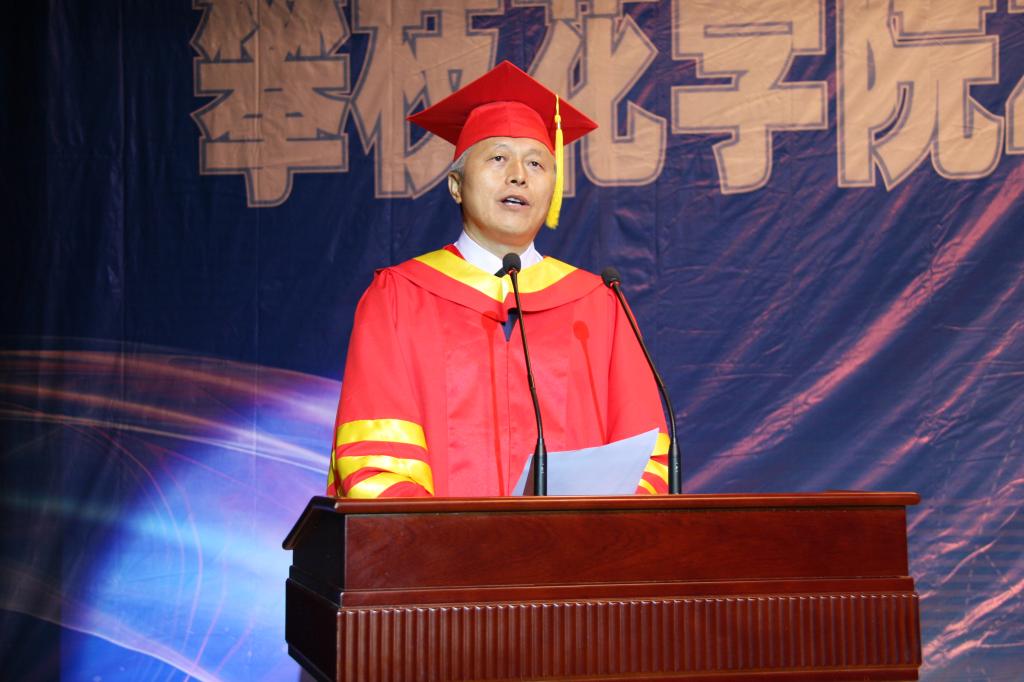 生化学院副院长蒋志强作为教师代表发言。他从“不要过分抱怨”“学会适应社会”“要自信,别信命”三个方面给予了毕业生建议。