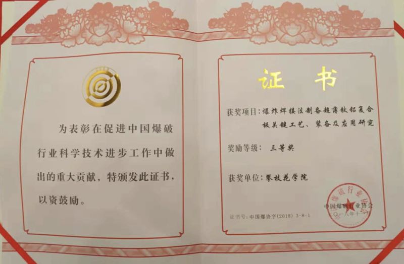 11月8日,中国爆破行业协会在北京隆重举行中爆协第九届科学技术奖颁奖大会。我校黄平、吴恩辉、张远、李军等师生团队的研究项目,《爆炸焊接法制备超薄钛铝复合板关键工艺、装备及应用研究》,获颁中国爆破行业协会科学技术进步三等奖。该项目得到了谢先启院士为组长的专家组“国际先进”的评价,通过了汪旭光院士牵头组织的中国爆破行业协会22位专家的获奖评审。该项目共五项专利,主要利用发明的化工产品制备钛铝复合材料,并将该复合材料制备手机边框等产品。