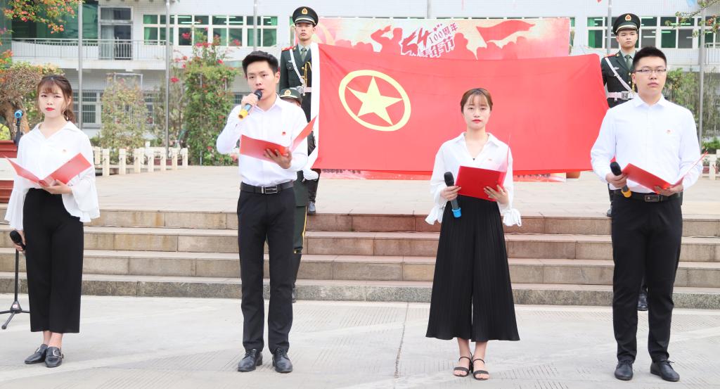 4月29日上午,我校在阳光广场举行“青春心向党·建功新时代”纪念五四运动100周年特别主题团日活动。活动包括升旗仪式、现场讲授微团课、团员学生代表献词朗诵、入团宣誓等内容。学校党委副书记、校长王曙光出席活动并为新团员颁发团员证。学校党委副书记、纪委书记彭徐出席活动并讲话。