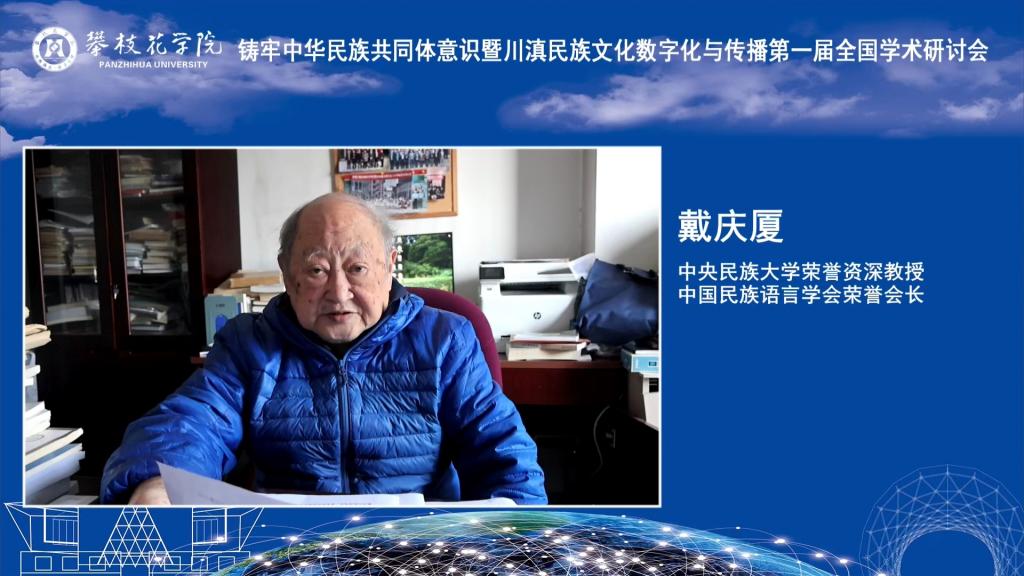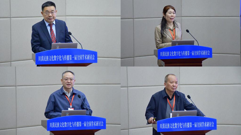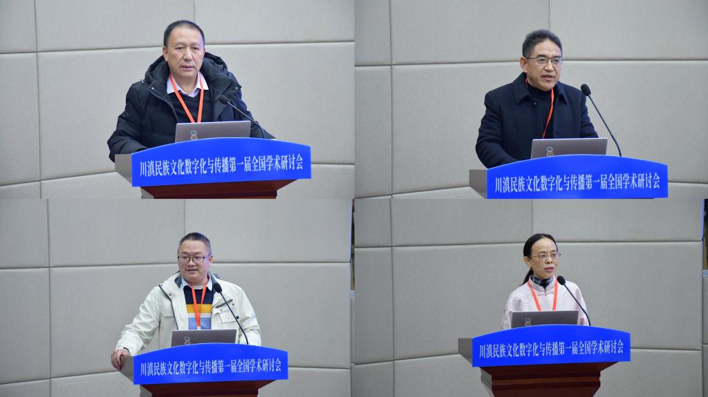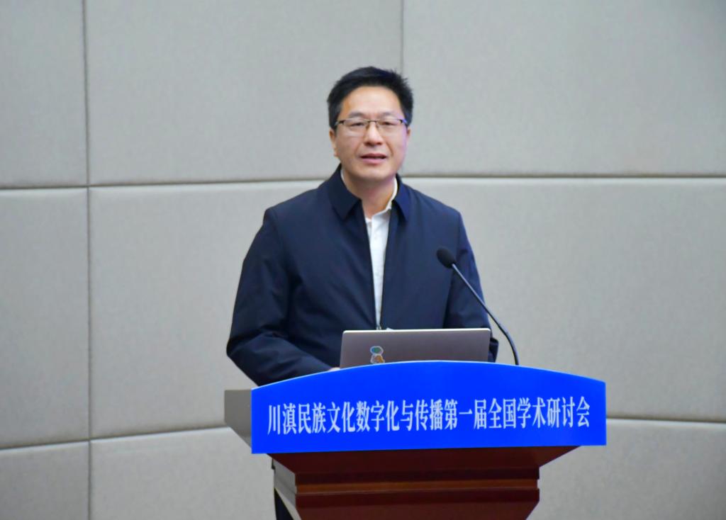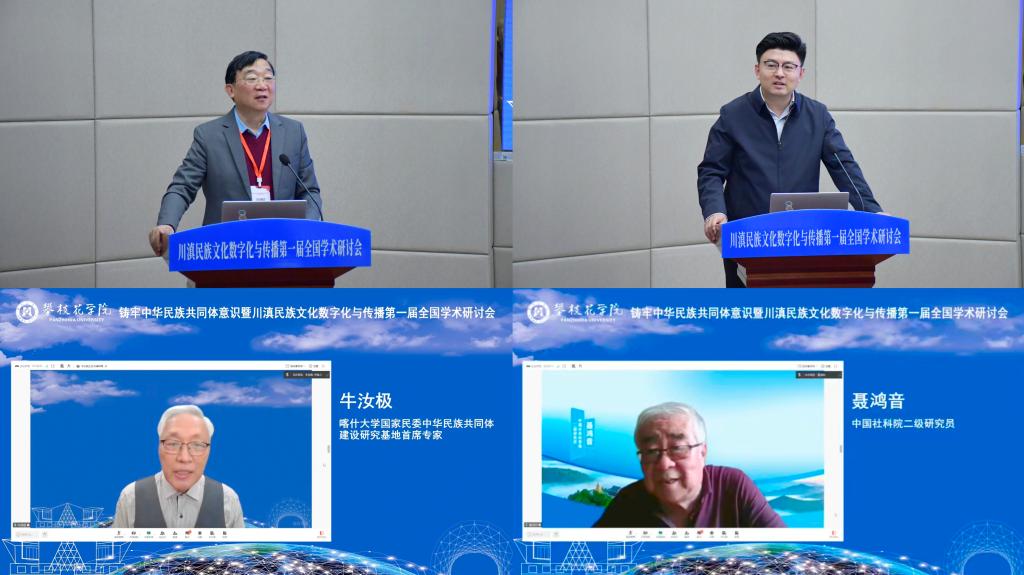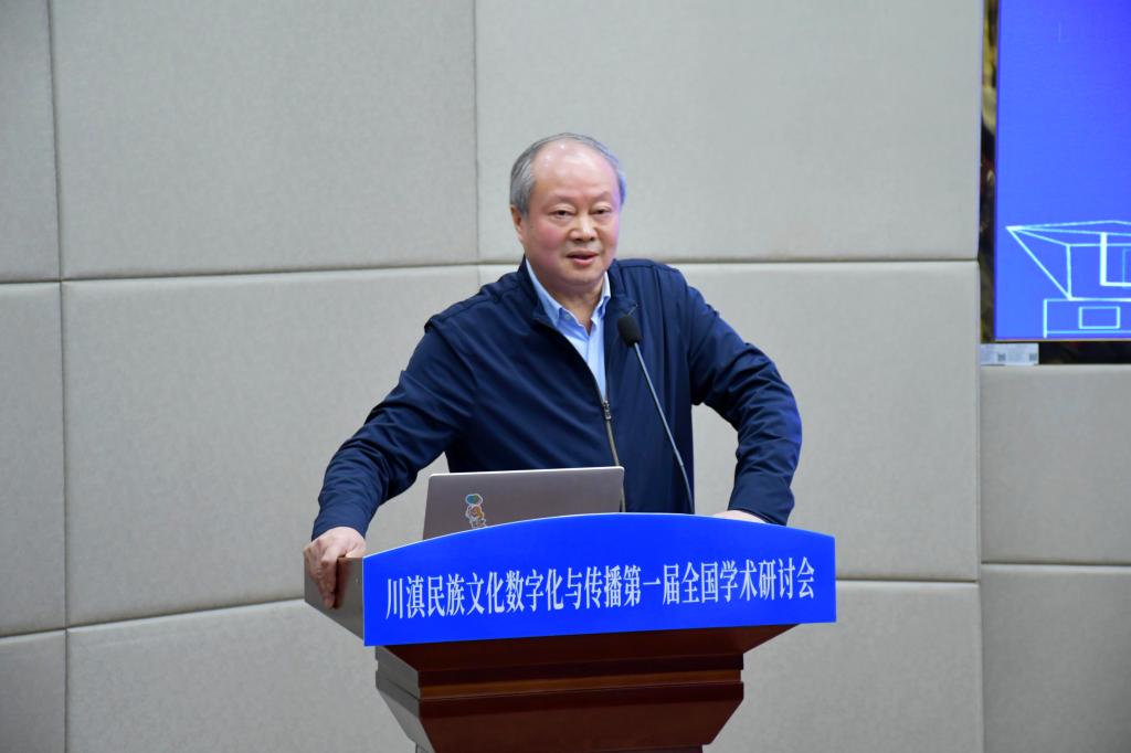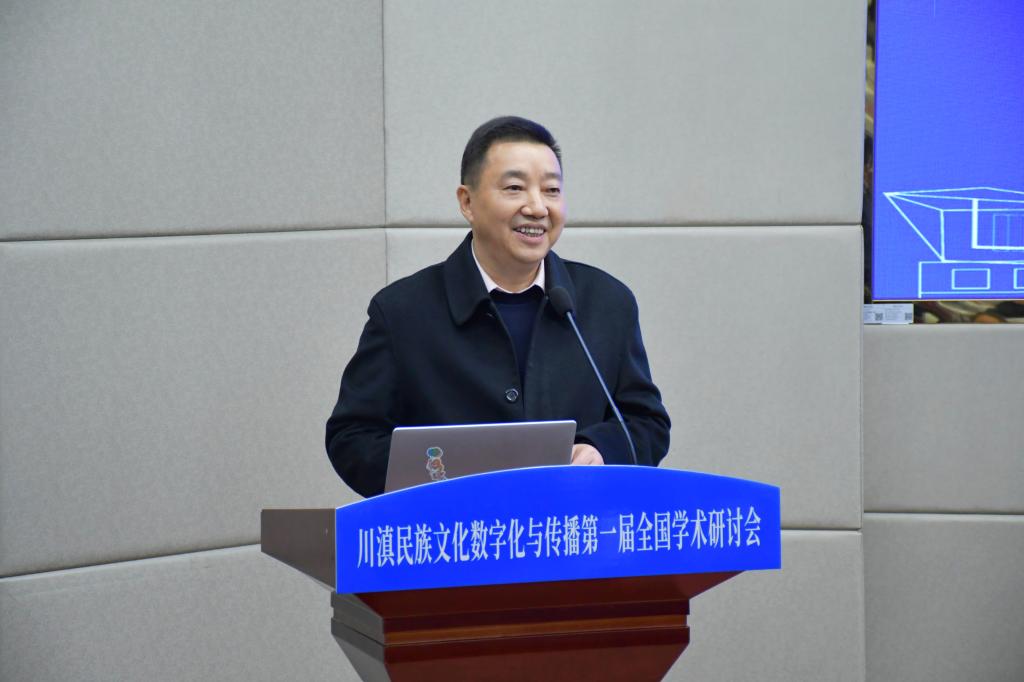 中央民族大学荣誉资深教授戴庆厦、欧洲科学与艺术院院士、教育部“长江学者”特聘教授曹顺庆通过线上方式致辞。戴庆厦指出,本次研讨会选题精准、意义深远,是时代需求和学者责任的结合,期待以数字化手段架起文化桥梁,以扎根田野、跨界融合、培育新人的实践,为铸牢中华民族共同体意识注入持久力量。曹顺庆强调,川滇地区地处藏羌彝走廊与南方丝绸之路核心腹地,多元共生的文化生态是铸牢中华民族共同体意识的深厚根基,数字技术为民族文化传承创新带来新机遇,本次研讨会将为推动构建民族文化自主知识体系,响应文化强国战略需求做出重要探索。