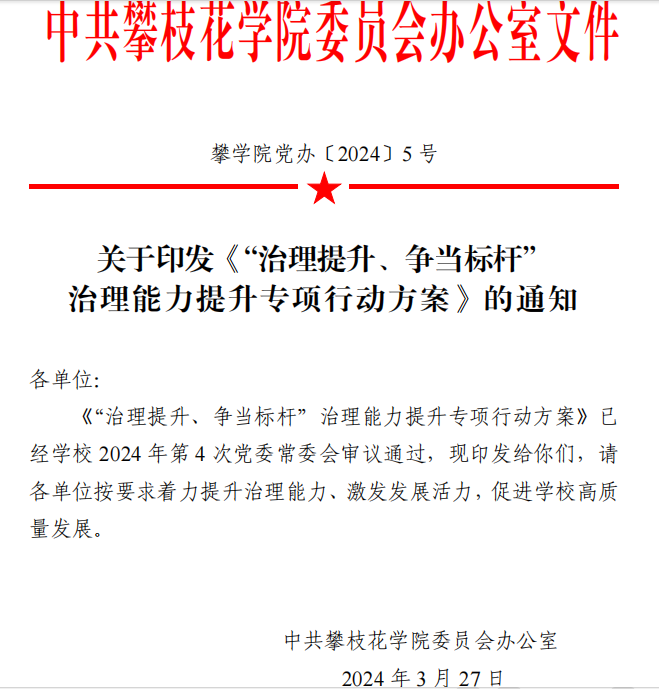 高等教育治理是国家治理的重要组成部分,积极推进高等教育治理体系和治理能力现代化,是新时代赋予高校的历史使命和中国特色现代大学制度建设的内在要求,也是建设应用型一流大学、办好人民满意教育的迫切需要。“十四五”以来,攀枝花学院始终坚持以习近平新时代中国特色社会主义思想为指导,全面贯彻党的教育方针,落实立德树人根本任务,紧紧围绕高质量发展主线,以治理现代化为抓手,持续深化校内改革,着力构建系统完备、科学规范、运行高效的现代大学治理体系,为推动建设阳光健康美丽的应用型一流大学奠定坚实基础。