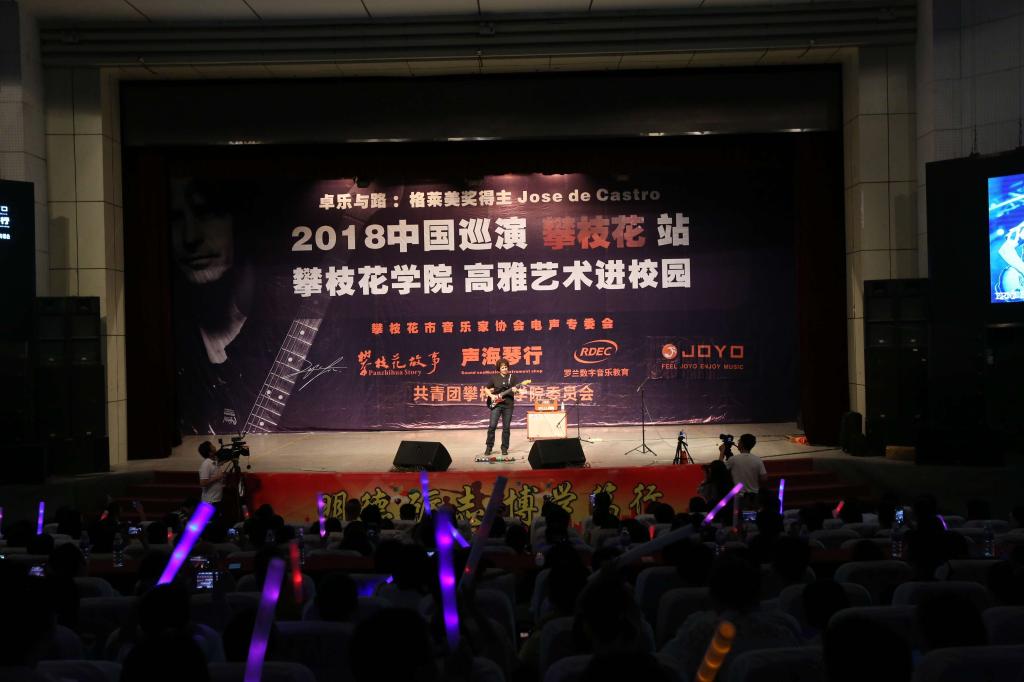 5月9日晚,由校团委、攀枝花故事主办的第58届格莱美音乐奖得主西班牙吉他大师Jose de castro“卓乐与路”指弹演奏音乐会在学校会堂落下帷幕。校内外千余名观众慕名而至,Jose de castro用古典吉他、电吉他等演绎了12首经典曲目,他以精湛的吉他弹奏技巧、独特的舞台风格为观众带来了一场来自异国的吉他视听盛宴。