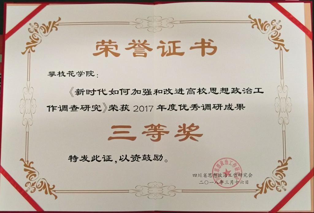 近日,四川省思想政治工作研究会发文(川政研〔2018〕5号),表彰四川省2017年度思想政治工作优秀调研成果,我校两项研究成果分别获一等奖和三等奖。