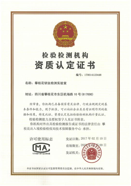 近日获悉,国家钒钛检测重点实验室(暨攀枝花钒钛检测实验室)再次获得中国合格评定国家认可委员会的实验室认可证书(CNAS)和国家认证认可监督管理委员会的资质认定证书(CMA),有效期均为6年,分别至2023年1月22日和2023年2月09日。实验室在2016年12月通过CNAS、CMA二合一资质的复评审基础上,经有效整改,取得上述证书。目前实验室开展的CNAS、CMA认证、认可项目达11种产品113项指标,具备出具国家级实验室认可(CNAS)、资质认定(CMA)和国际互认(ilac-MRA)标识的资质。新二合一资质证书的获得为进一步建设好和发展好国家钒钛检测重点实验室奠定了坚实基础。