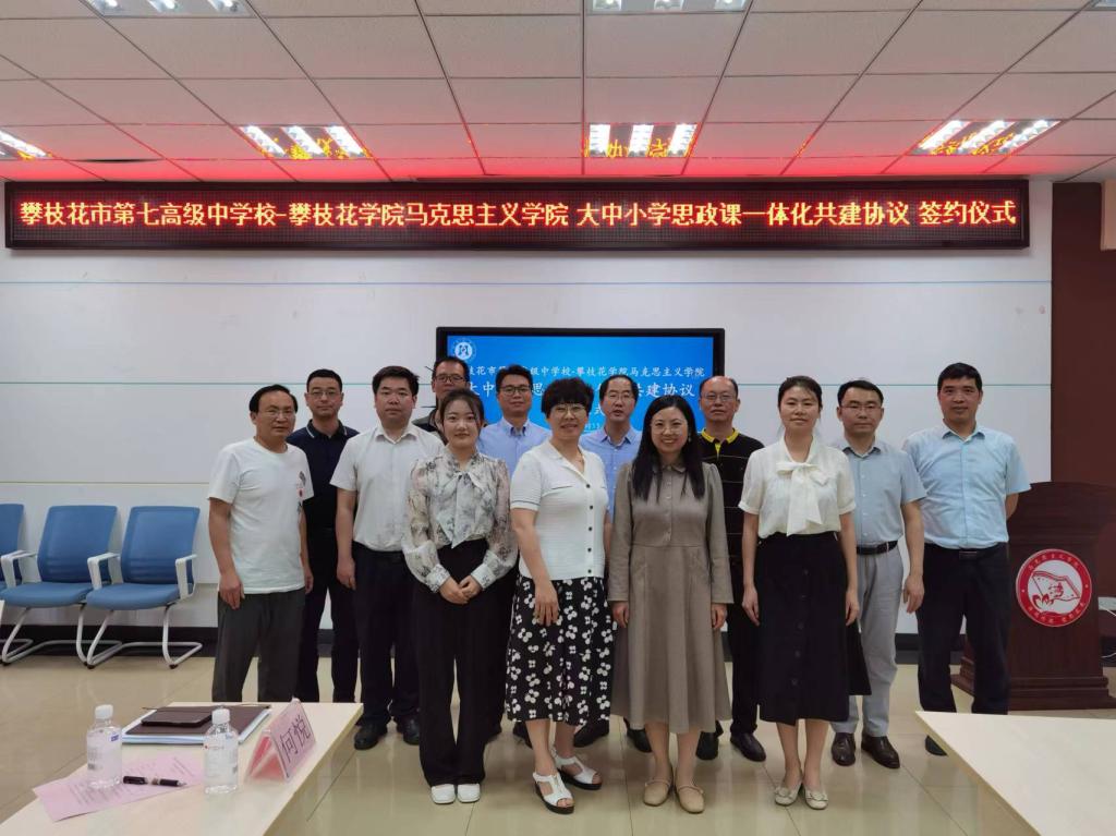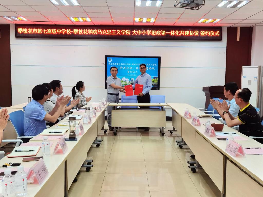 为进一步健全大中小学思政课一体化教育体系,丰富“大思政”育人内涵,全方位构建起协同配合、同向同行的一体化工作机制,我校马克思主义学院与攀枝花市第七高级中学校大中小学思政课一体化共建协议签约仪式于3月15日下午在马克思主义学院会议室举行。攀枝花市第七高级中学校党委书记杨鸿、校长李刚、副校长牟厚均、德育和艺体科科长李丽娟,攀枝花学院马克思主义学院党委书记张清学、副院长罗春秋、心理健康中心主任李玲及各教研室主任出席会议。会议由马克思主义学院党委副书记、纪委书记吴婷婷主持。