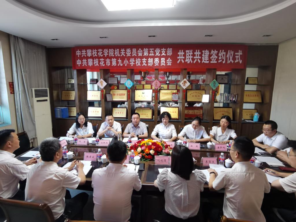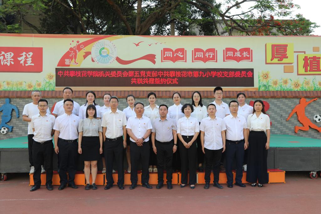 为推进大中小学思想政治教育一体化建设,丰富育人资源、拓展育人空间,形成协同育人格局,4月10日上午在攀枝花市第九小学校举行了攀枝花学院机关党委第五支部和攀枝花市第九小学校党支部“共联共建”合作签约仪式。学校党委常委、组织部部长苏兴仁,东区教体局党组书记、局长曾清林,机关第五党支部、第九小学党支部20余名党员参加了签约仪式。