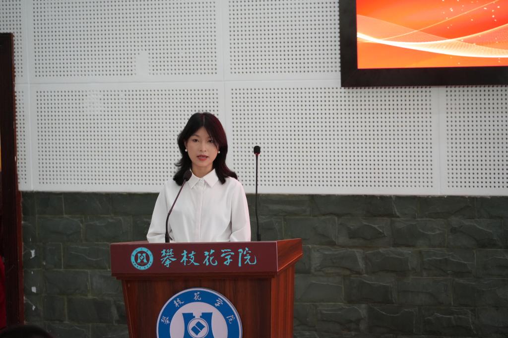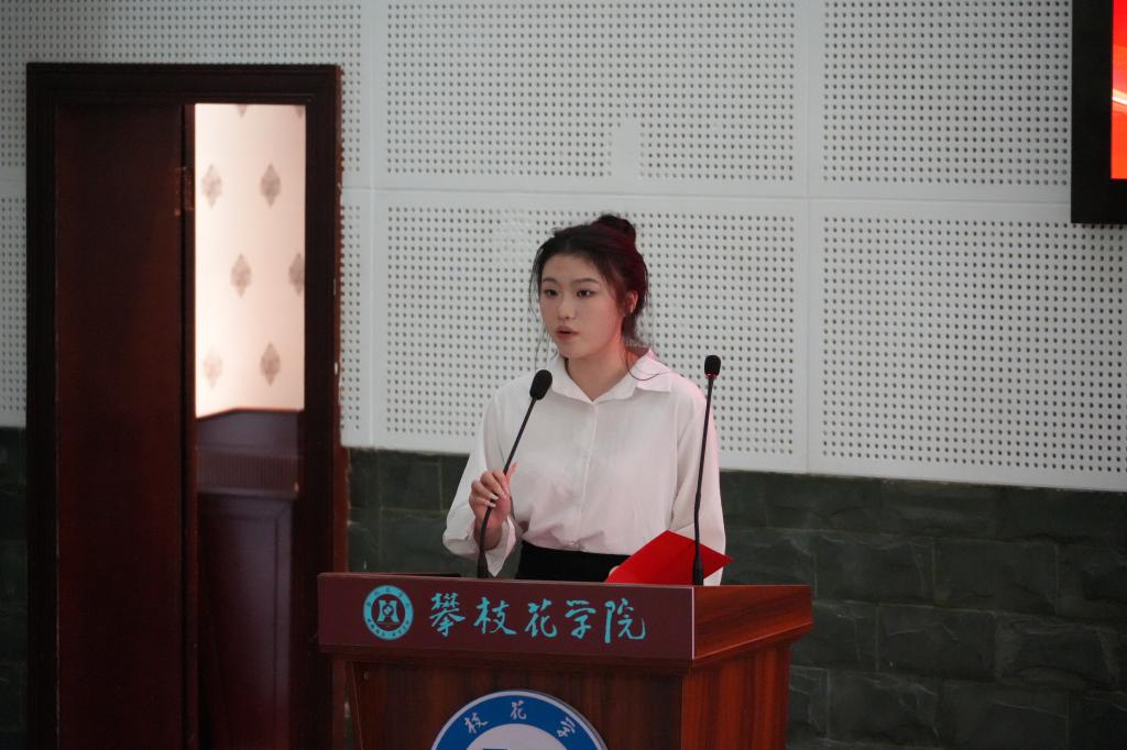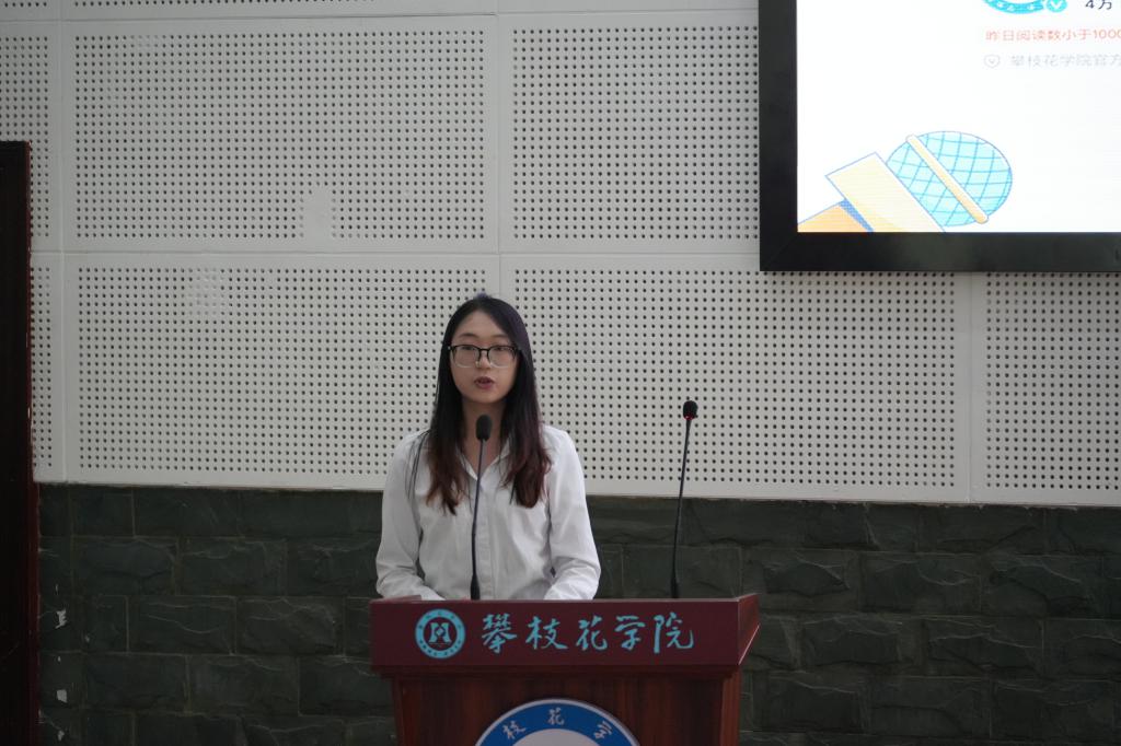 文学院工作站站长邓佳燕代表优秀传媒组织发言。她分享了文学院工作站出新出彩的经验,表达了对新一届传媒接班人的期望和对攀大传媒发展的祝愿。