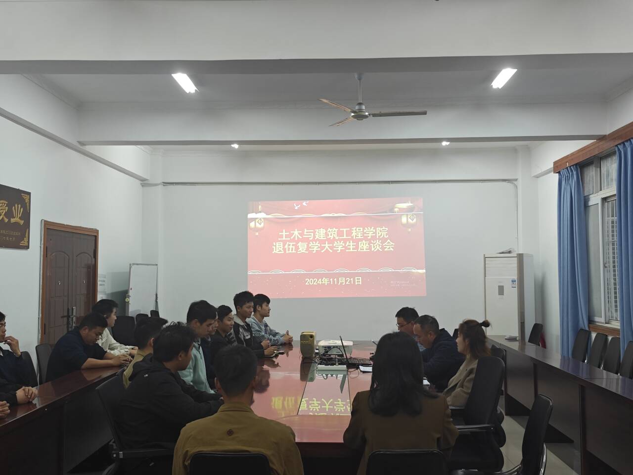 为推进“三全育人”新格局,关心退伍复学大学生成长成才,土建学院于11月21日晚,在励志楼103会议室召开学院2024年下半年退伍复学大学生座谈会,学院分管学生工作领导、学生科科长、分团委书记、全体辅导员及19名退伍复学大学生参加座谈。