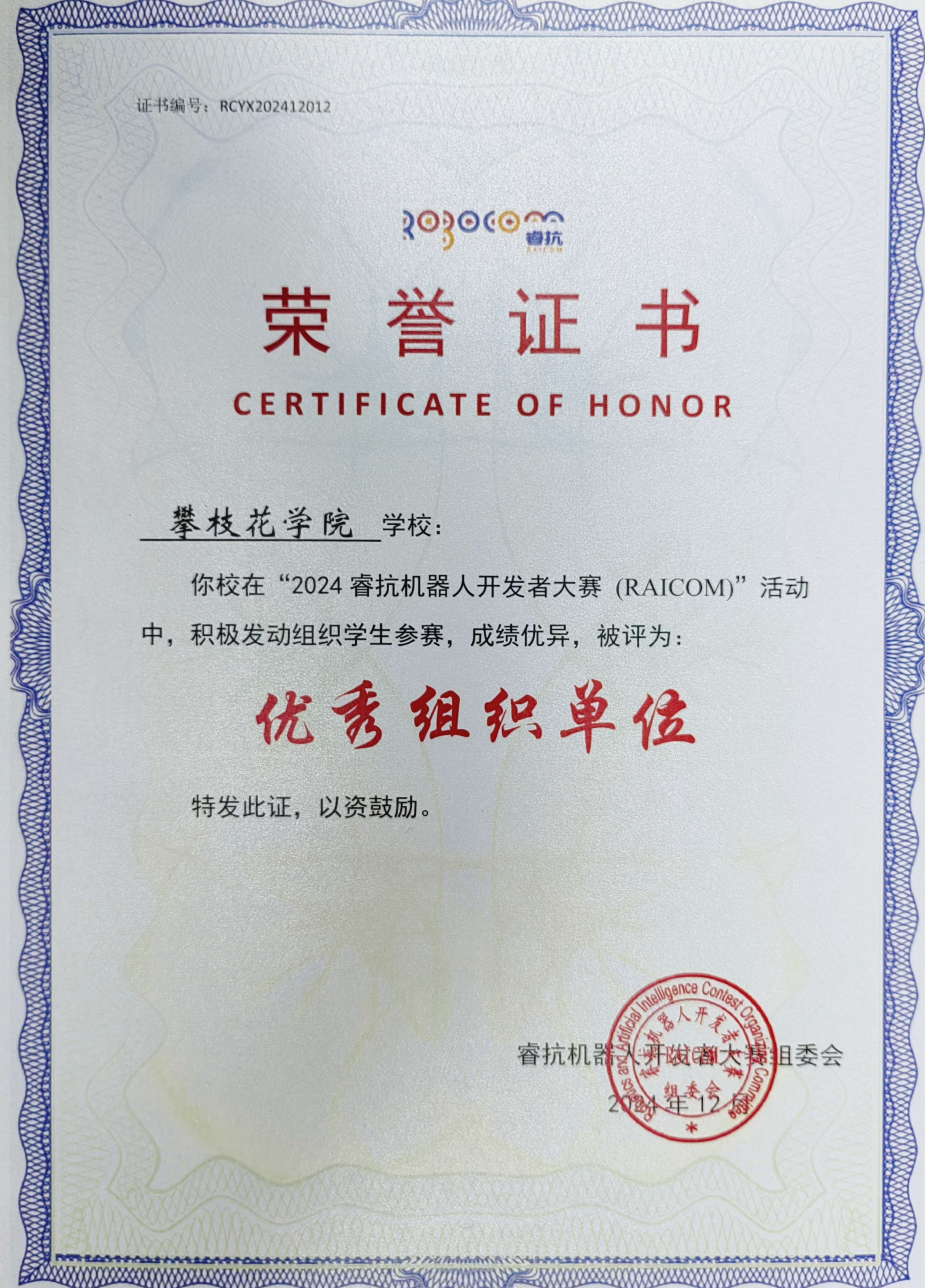 近日,从睿抗机器人学术年会传来喜讯,我校以卓越的组织能力和显著的竞赛成果荣获“优秀组织单位”奖项。这一荣誉不仅展现了我校在机器人领域教育与实践的卓越成果和积极贡献,也是对学校相关科研团队在推动科技创新和人才培养方面所做努力的肯定。