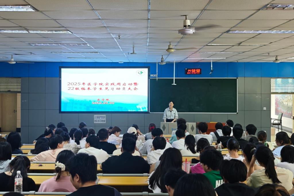 6月30日下午,医学院在勤学楼J1-1教室举行2025年实践周启动仪式暨2022级临床医学本科生见习动员大会。基础医学院党委书记王鹃、教师代表以及临床医学专业大一至大三全体在校学生参加了此次大会。