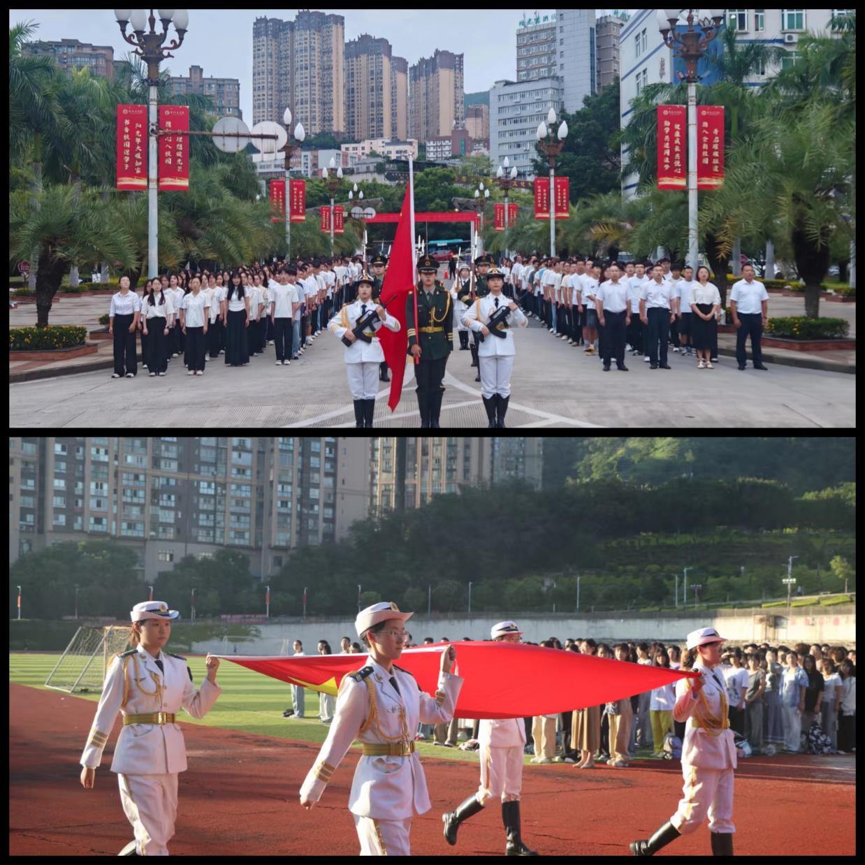 伴随着激昂的《义勇军进行曲》,五星红旗冉冉升起,全体师生肃立凝视、齐声高唱国歌,向伟大祖国致以崇高敬意。