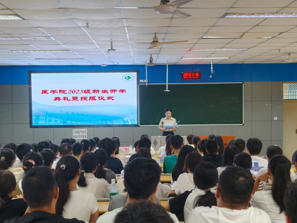 9月8日上午,医学院2025级新生开学典礼暨授服仪式在西苑勤学楼J1-1举行。基础医学院院长赵牧、党委书记王鹃、副院长徐万宇、党委副书记任娟,各科室负责人、教师代表与全体2025级新生参加典礼。仪式由分团委负责人李静主持。