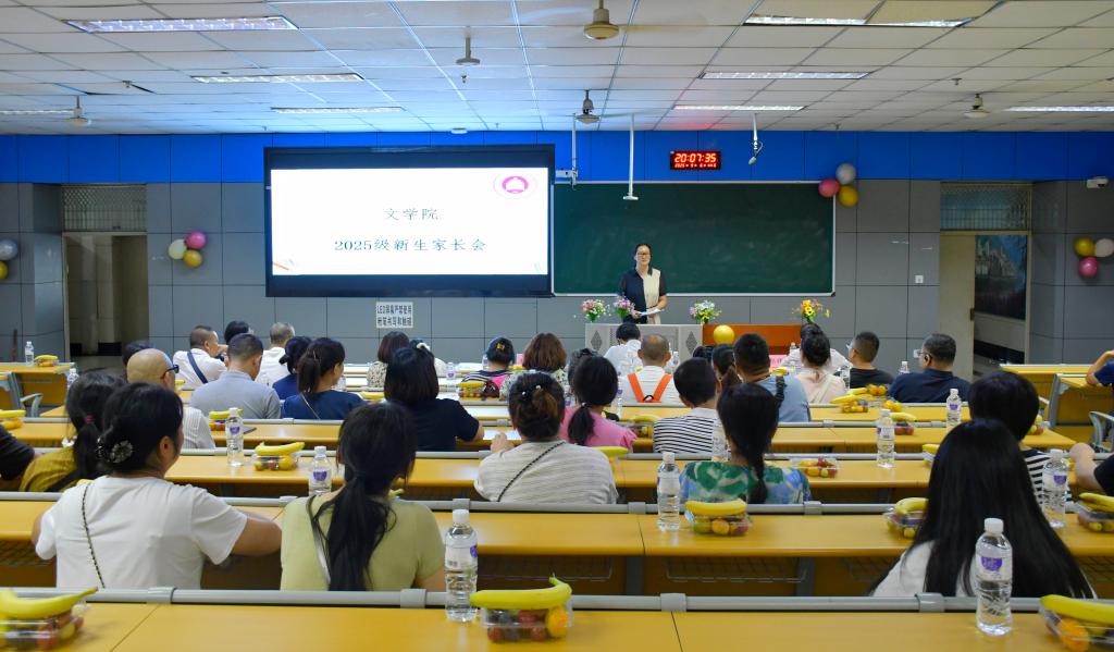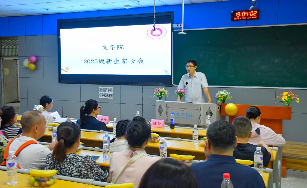 为加强家校沟通,助力新生更好地适应大学生活,文学院于9月6日晚在西苑勤学楼J1-1教室召开2025级新生家长座谈会。文学院党委书记王春梅、党委副书记郑辉、副院长陈松、2025级新生辅导员王雪梅和70余名新生家长代表参加。会议由郑辉主持。