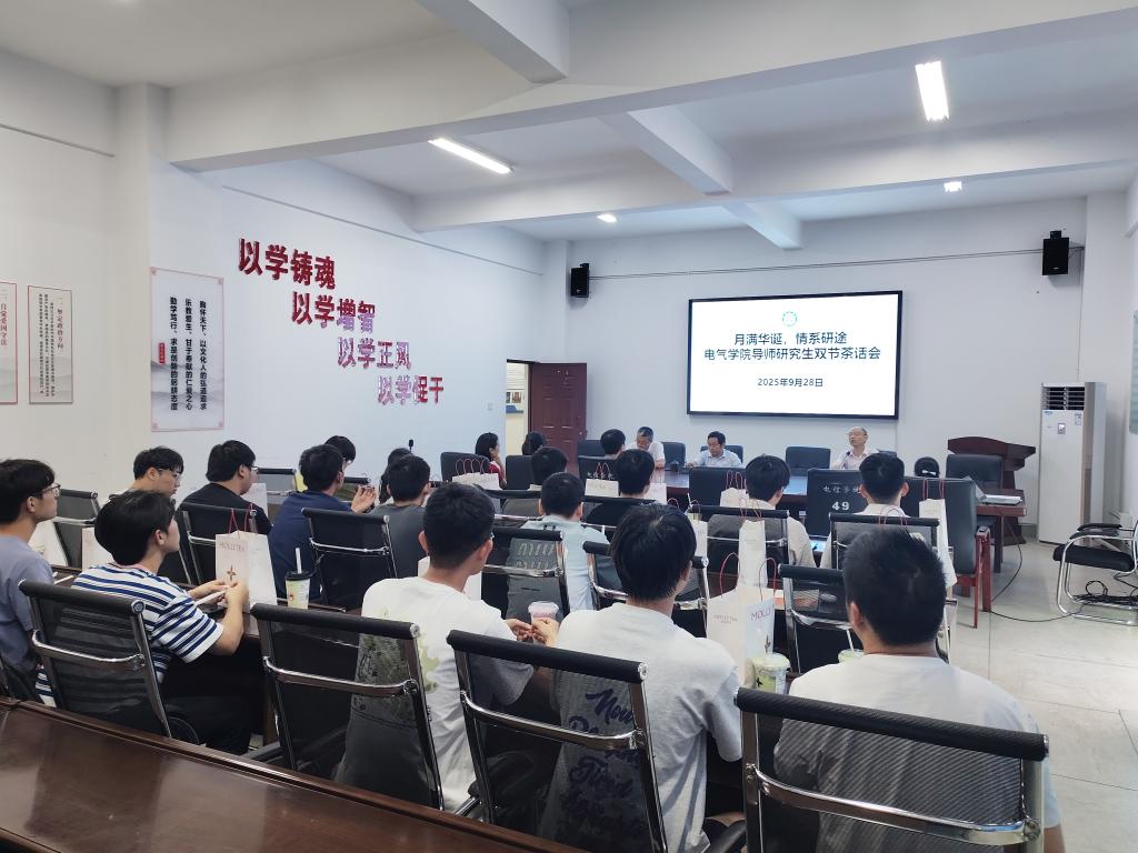 中秋逢国庆,情暖电气园。9月28日下午,电气信息工程学院在学院会议室举办“月满华诞·情系研途”导师研究生双节茶话会。学院领导、研究生导师及全体研究生欢聚一堂,畅谈科研心得、共叙师生情谊,喜迎双节到来。院长向国齐、副院长帅定新、廖其龙,研究生导师、研究生管理相关人员以及学院全体研究生参加会议。会议由副院长帅定新主持。