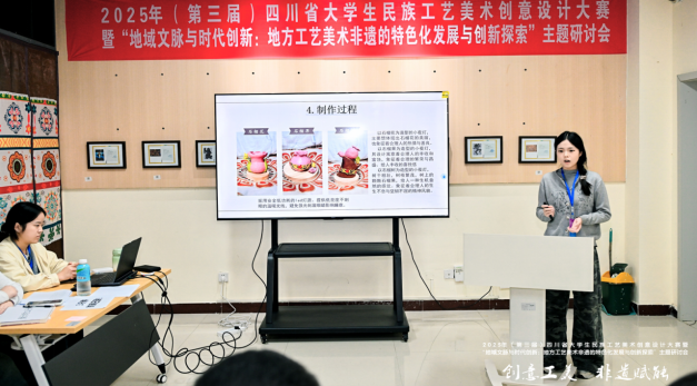 在决赛作品陈述环节中,我校学子沉着自信,清晰阐释创作理念与工艺技法,赢得评委认可。同日,师生参与了“非遗活态展示与体验活动”,聆听专家讲座,进一步加深了对非物质文化遗产的理解与认同。