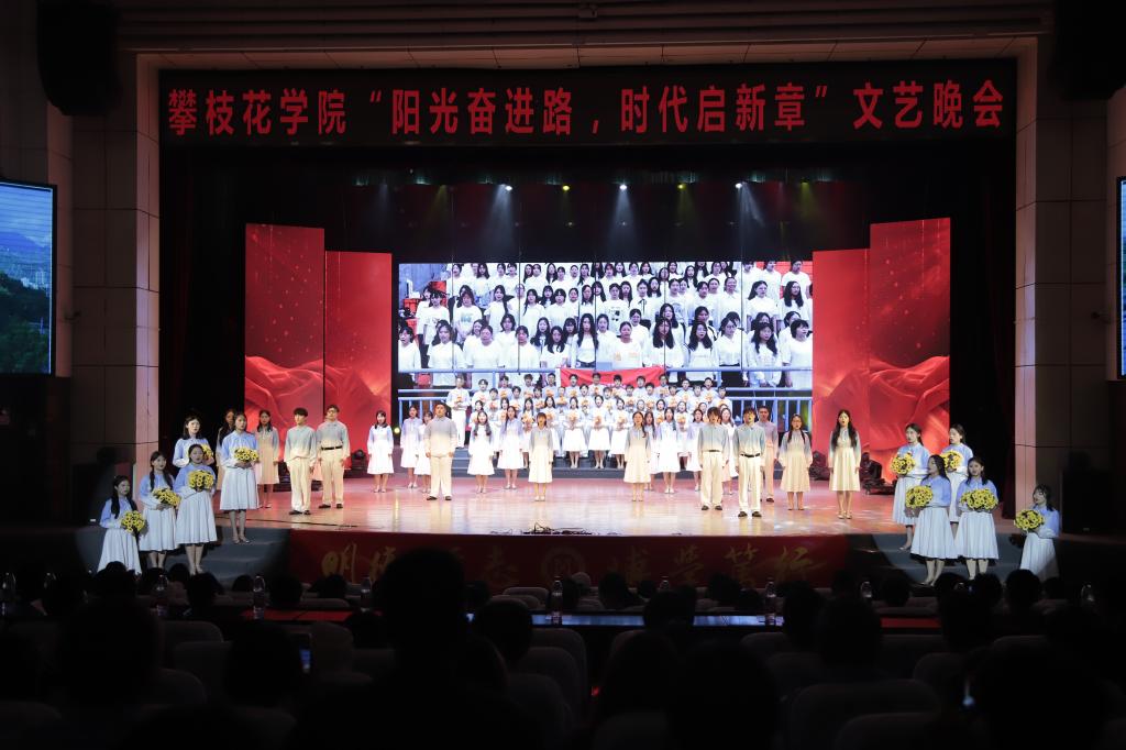 晚会的尾声,合唱团演员唱响主题合唱《有我》,“请党放心,强国有我”的青春誓言在会场回荡,将整场晚会的气氛推向最高潮。歌声凝聚了攀大师生将以阳光奋进之姿,在新时代的宏伟篇章中留下无悔足迹的坚定信念。整场晚会在大气恢宏的合唱中圆满落下帷幕。