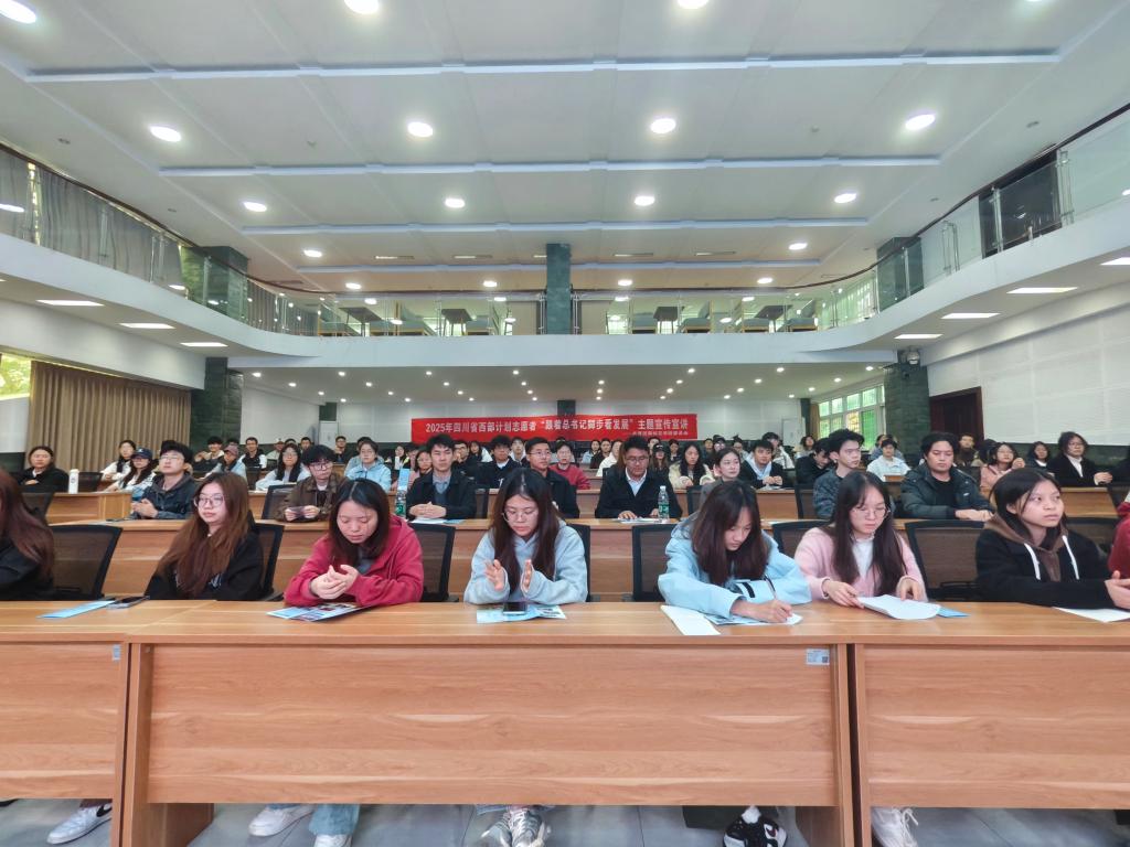 为深入学习宣传贯彻习近平总书记给谢依特小学戍边支教西部计划志愿者服务队队员的重要回信精神,通过扎根基层的志愿者视角展现祖国发展成就与新时代四川的蓬勃气象,激励更多攀大学子投身西部、服务基层。11月19日下午,校团委在博雅厅召开2025年第二期“阳光讲堂”——四川省西部计划志愿者“跟着总书记脚步看发展”主题宣讲。校团委负责人、西部计划市项目办负责同志、2025年四川省西部计划市级宣讲团成员、往届优秀志愿者代表,以及学校意向报名学生代表共计120余人参加。