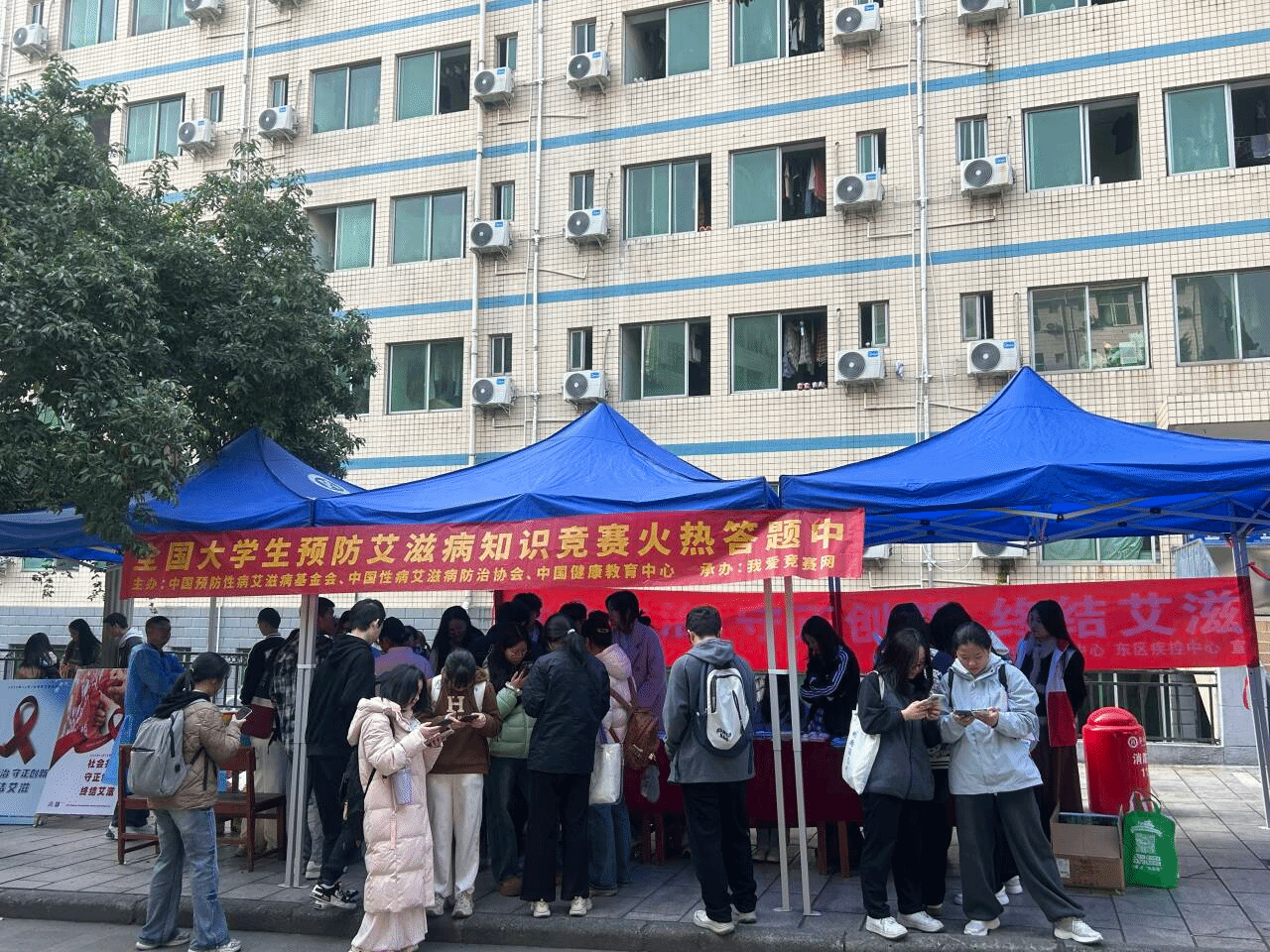 12月1日至2日,东华山校区和公园校区学生社区同步启动现场宣传活动。活动现场设置主题签名墙、防艾科普展板,志愿者累计发放宣传资料1000余份,通过防艾知识问答、红丝带手工制作等互动形式,让科学防艾理念在趣味参与中扎根人心。市、区疾控中心专业人员现场提供免费保密检测与一对一咨询服务,近500名学生主动参与咨询检测,主动筑牢自我防护屏障。