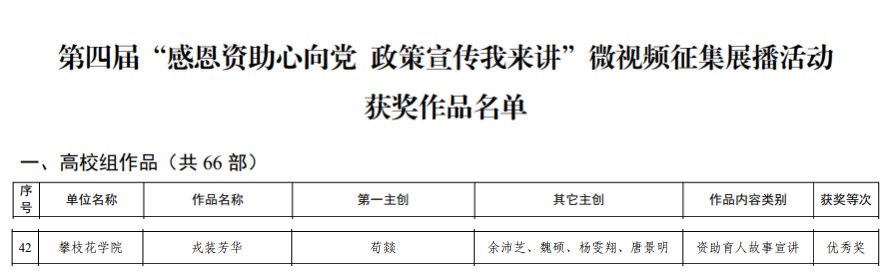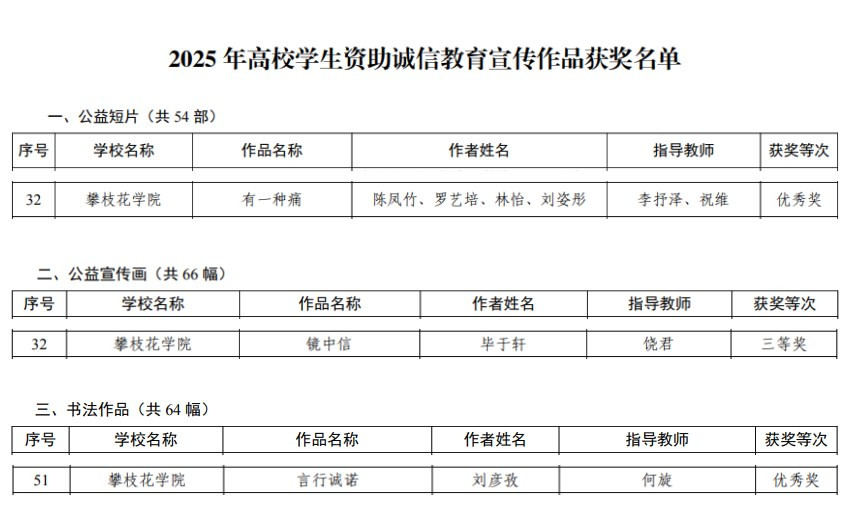 近日,四川省教育厅公布2025年全省高校学生资助诚信教育主题活动评奖结果,我校在“诚信主题宣传作品”与“感恩资助心向党”微视频征集展播中表现突出,共获三等奖1项、优秀奖3项,学校荣获“优秀组织奖”。