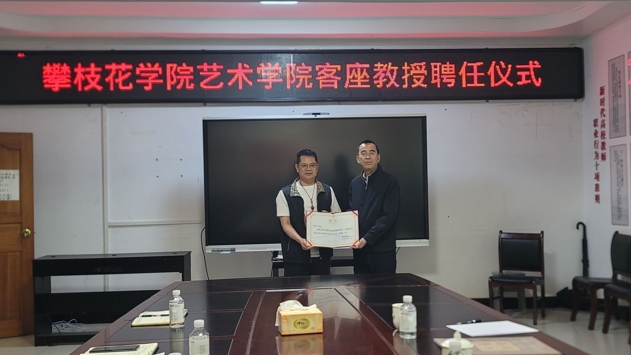 3月2日下午,我院在游艺楼会议室举行客座教授聘任仪式。清华大学美术学院书法系客座教授、非遗(茶艺)技艺传承师罗异,攀枝花学院党委常委、副校长张旭辉,招生就业处处长唐林,优秀校友何建平,以及文学院、艺术学院相关负责人出席本次仪式。会议由艺术学院党委副书记、院长孙载斌主持。