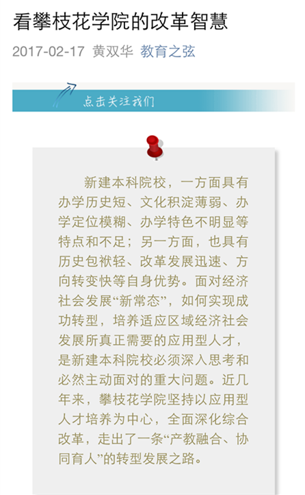 近日,教育部学校规划建设发展中心的官方微信——“教育之弦”推送了《看攀枝花学院的改革智慧》一文。该文由校长黄双华撰写,并于2016年12月12日以《产教融合 协同育人 扎实推进转型发展——新建本科院校攀枝花学院深化改革的实践探索》为题在中国教育报刊登。文章深入研究总结了学校近几年坚持以应用型人才培养为中心,全面深化改革,在产教融合、协同育人方面的思考和实践。