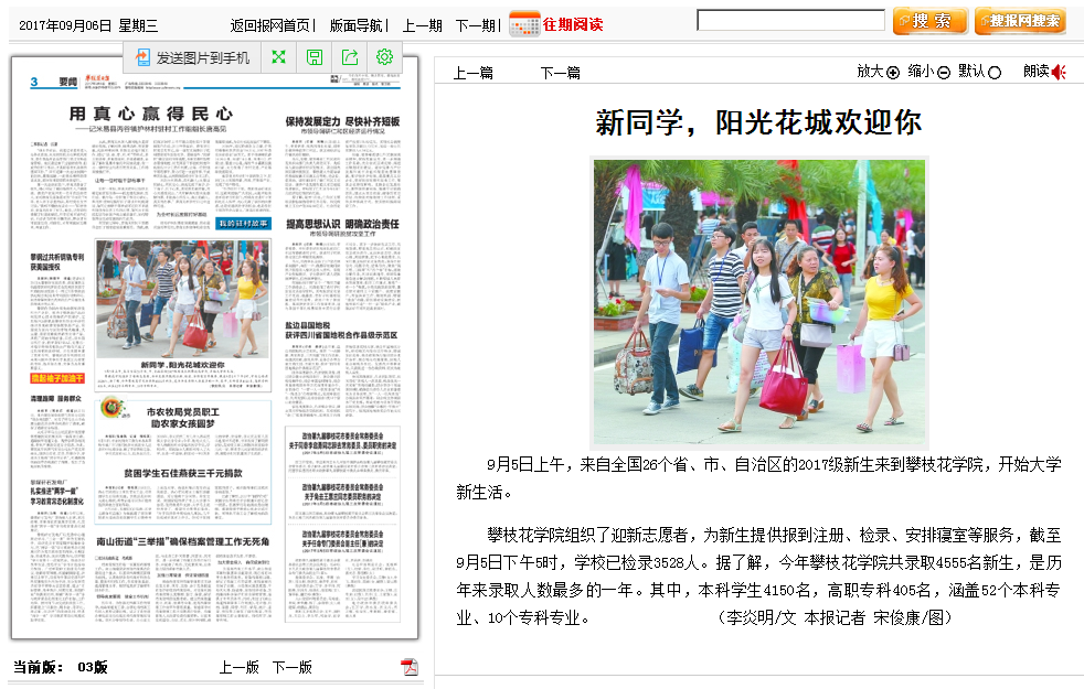 为及时、集中、快速报道学校迎新情况,学校传媒中心通过校园新闻网、官方微信、广播电视以及“一直播”网络直播等平台开展了“2017•以心迎新”系列报道,消息受省市媒体关注。四川新闻网、四川省教育厅四川教育网和中国高校之窗等网络平台相继转发报道了我校迎新工作;《攀枝花日报》分别于9月6日、8日报道我校迎新、开学典礼等情况,攀枝花市电视台于9月5日对我校康养学院迎新情况进行了专题报道。