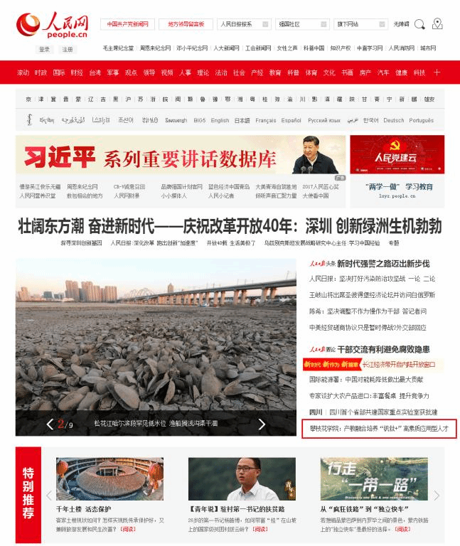人民网首页:报道我校办学特色和成效