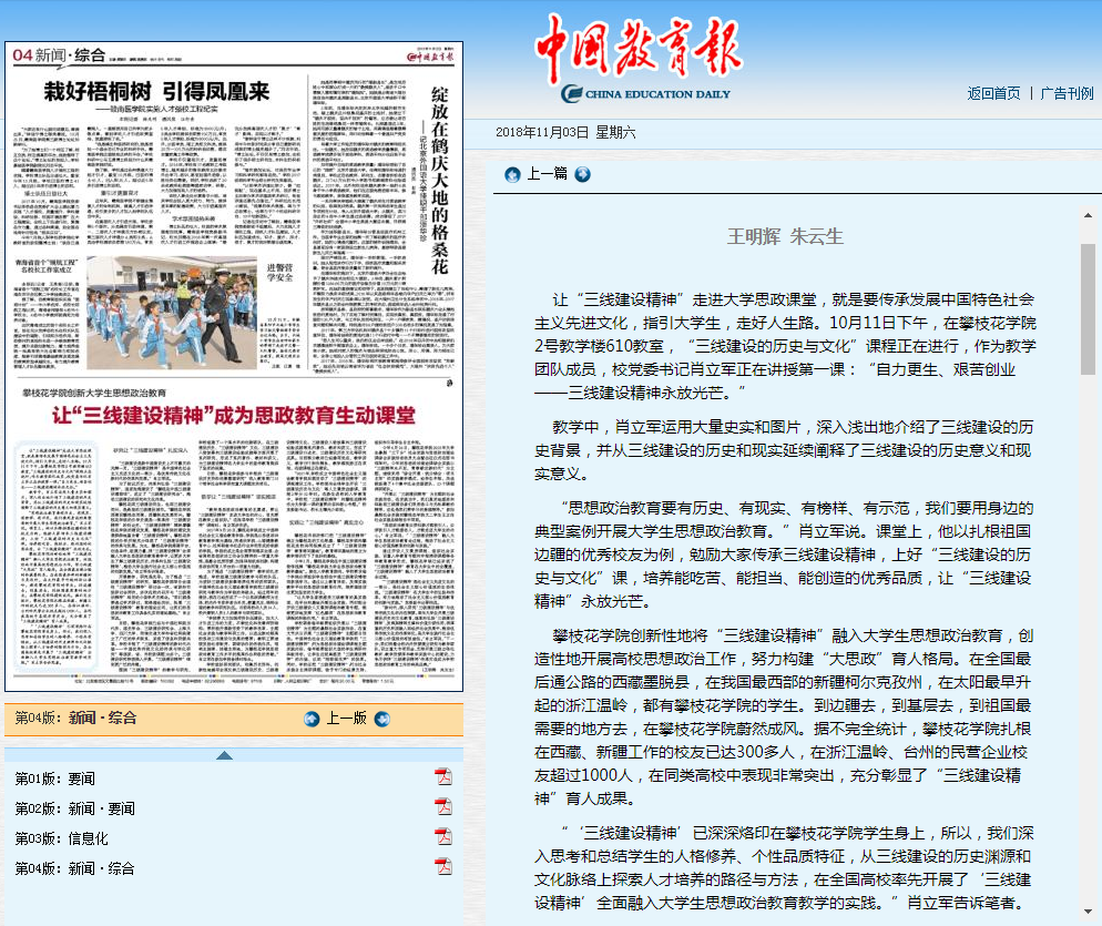 11月3日,《中国教育报》以《让三线建设精神成为思政教育生动课堂》,专题报道我校大学生思想政治教育工作创新做法。
