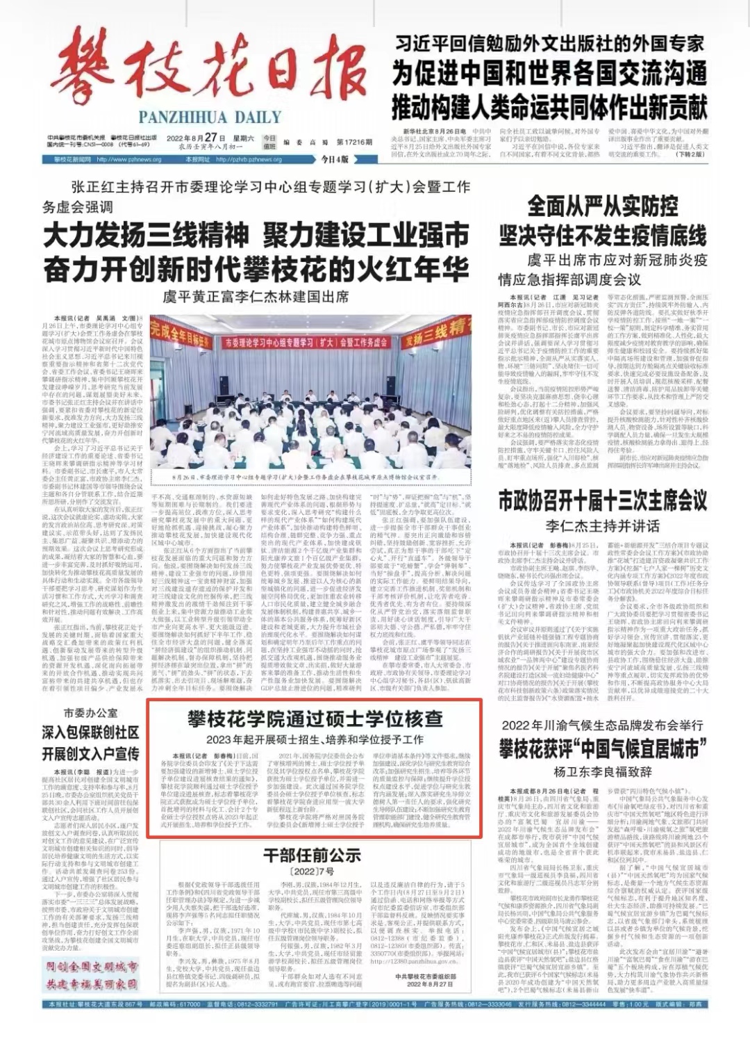 日前,国务院学位委员会印发了《关于下达需要加强建设的新增博士、硕士学位授予单位建设进展核查结果的通知》,我校顺利通过了硕士学位授予单位建设进展核查,首批增列的材料与化工、会计2个专业硕士学位授权点将从2023年起正式开展招生、培养和学位授予工作。攀枝花日报8月27日头版对此进行报道。