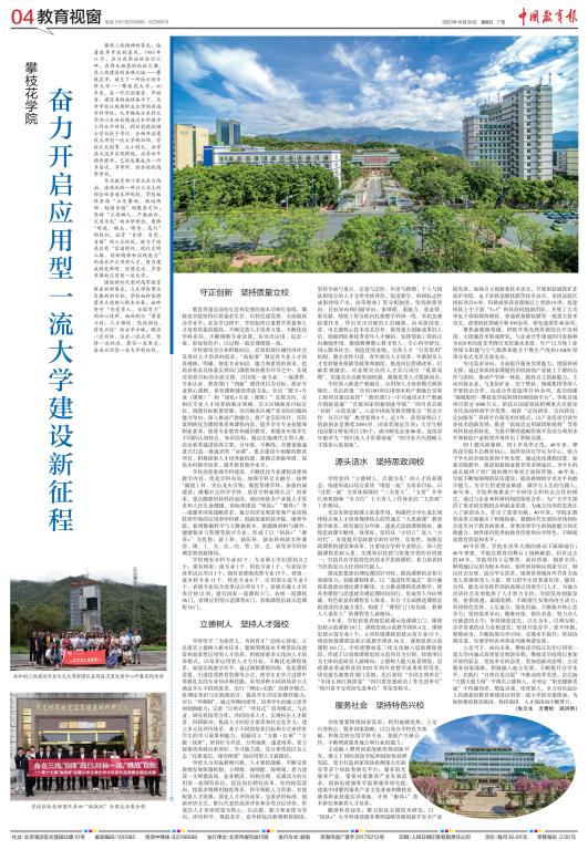 在学校40周年校庆即将到来之际,10月29日,中国教育报以《攀枝花学院·奋力开启应用型一流大学建设新征程》为题,重点围绕“质量立校、人才强校、思政润校、特色兴校”,以整版篇幅全面展现了学校建校40年来的发展历程和办学实绩,积极展望了学校迈步应用型一流大学内涵式高质量发展新征程的美好蓝图。